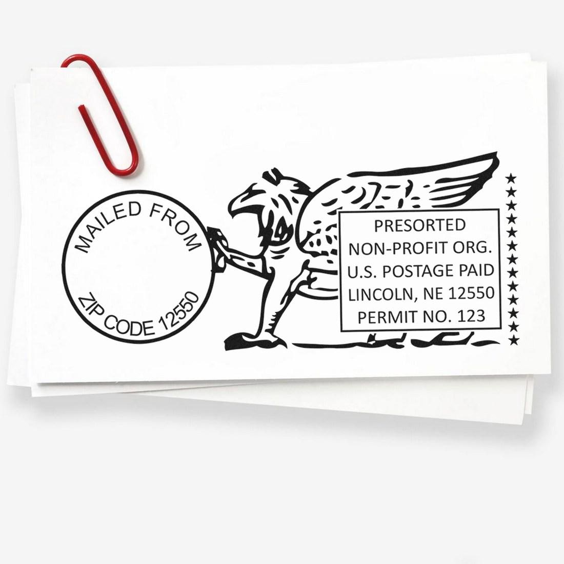 ● The stamp typically includes specialized formatting, such as a POSTNET or Intelligent Mail barcode, which helps postal systems identify and process each item quickly.