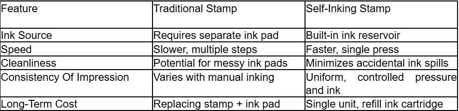 Below is a brief comparison of traditional rubber stamps and self-inking stamps: