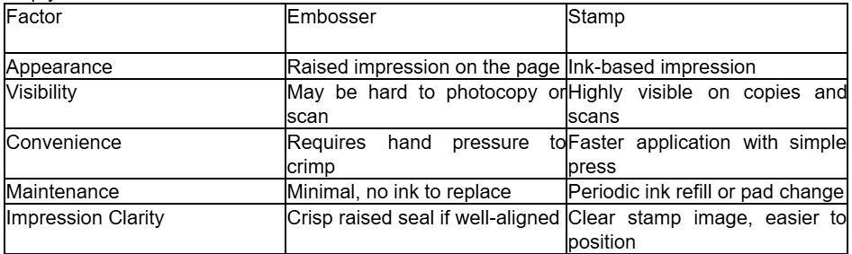 If you frequently notarize documents that will be scanned or photocopied, you might prefer an ink stamp for clear visibility.If you want a more traditional, embossed approach, an embosser provides a dignified feel.Some notaries keep both on hand, using the embosser for official documents that demand a classic look and the stamp for those that require crystal-clear legibility in digital format.