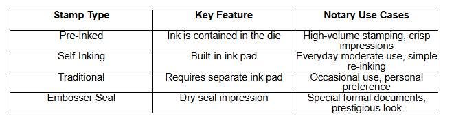 Though the focus here is on pre-inked Louisiana notary stamp options, you might still want to know about the broader range of tools available. Often, you will want more than one stamp style in your notarial toolkit to cover varying situations. Below is a quick comparison to help you decide if you want a pre-inked stamp alone or if you also need a seal embosser or self-inking stamp.